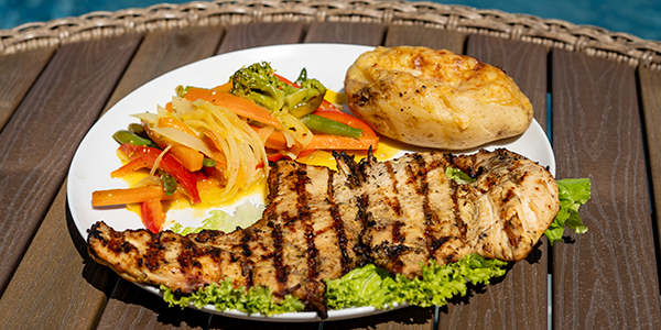 Una pechuga completa de pollo a la parrilla, al vapor o empanizada.