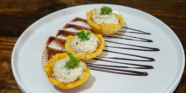 Deliciosas y crujientes canastas de plátano, rellenas de pasta de pechuga de pollo.