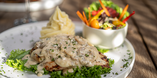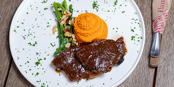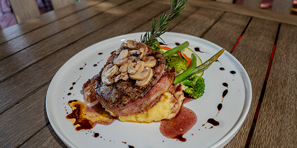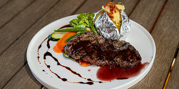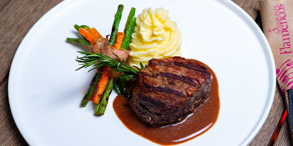 Jugoso y tierno Churrasco de res de calidad premium, servido en salsa al vino. Acompañado de Vegetales salteados y delicioso pure de papa.