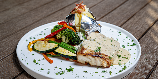 Tierno filete de pescado en salsa de limón, con una cama de vegetales salteados y pure de papa.