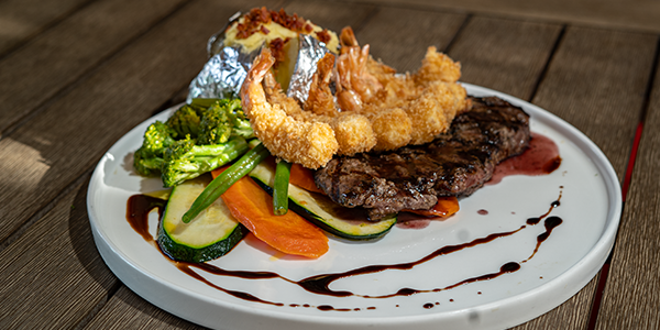 Carne de res premium con camarones empanizados, sobre una cama de vegetales salteados.