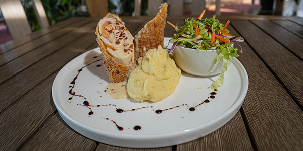 Deliciosa Pechuga de pollo desguazada y sin piel, envuelta en finas lonchas de jamón y diferentes tipos de quesos derretidos.