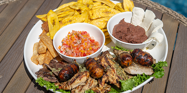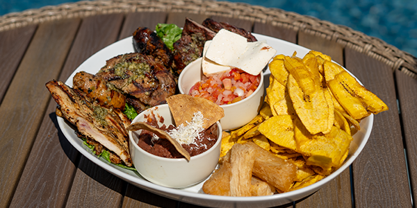 Chimol, bastones de yuca frita, tajadas o tostones de plátano, chips de malanga sazonada, rice and bean.
