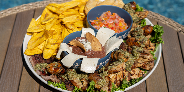 4 Oz solomillo de res, 2 chorizos, 6 Oz de pollo a la parrilla, 6 Oz de lomo de cerdo a la
